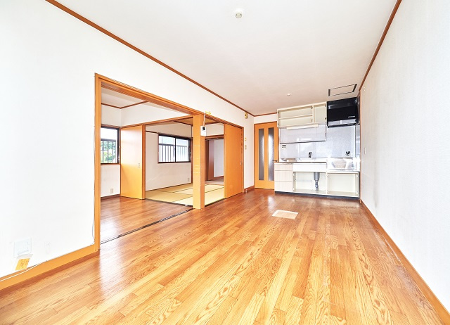 9.5帖DK。隣の洋室の扉は大きく開くタイプです。