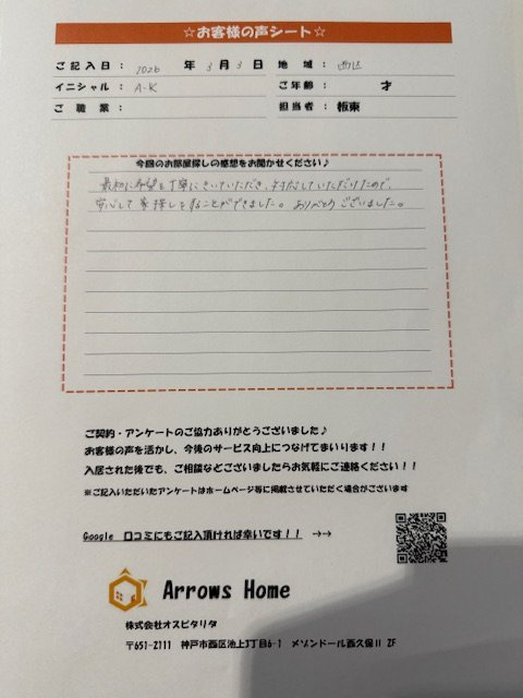 神戸市周辺の賃貸マンション|Arrows Home > お客様の声一覧 > A・K 様